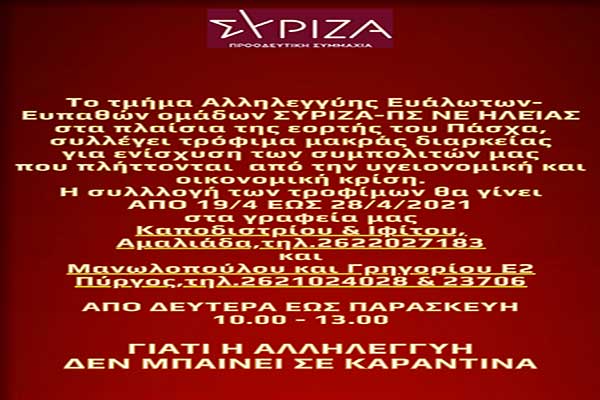 ΣΥΡΙΖΑ-ΠΣ Ηλείας: Δράση στα πλαίσια της εορτής του Πάσχα