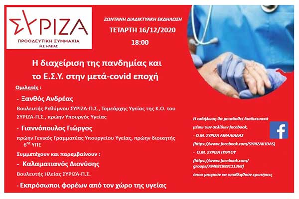 ΣΥΡΙΖΑ Ηλείας: Διαδικτυακή εκδήλωση για την υγεία