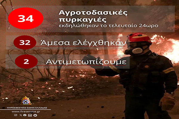 Πυροσβεστική: 34 αγροτοδασικές πυρκαγιές το τελευταίο 24ωρο