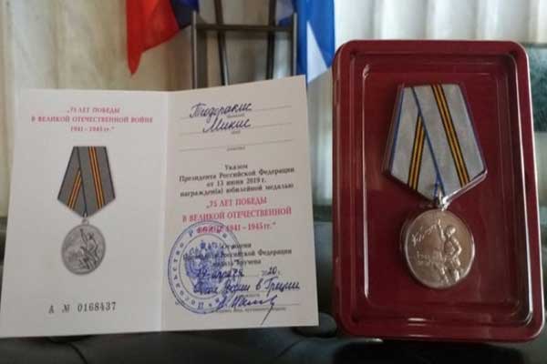 Επιδόθηκε στον Μίκη Θεοδωράκη το ρωσικό μετάλλιο «75 χρόνια από τη Νίκη στον Μεγάλο Πατριωτικό Πόλεμο»