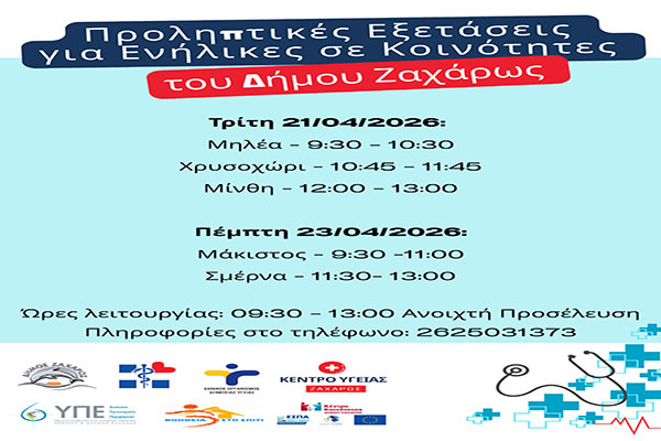 Ο Δήμος Ζαχάρως καλεί όλους τους ενήλικες πολίτες να αξιοποιήσουν τη δράση και να συμμετάσχουν ενεργά, ενισχύοντας την πρόληψη και τη φροντίδα της υγείας τους.