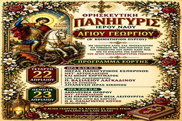 Μέσα στη χαρά και στη λαμπρότητα της Αναστάσεως του Κυρίου, ο Ιερός μας Ναός, πανηγυρίζει με ιεροπρέπεια και μεγαλοπρέπεια, την Ιερή μνήμη του Αγίου ενδόξου Μεγαλομάρτυρος και Τροπαιοφόρου Γεωργίου, την προσεχή Τετάρτη 22 και Πέμπτη 23 Απριλίου.