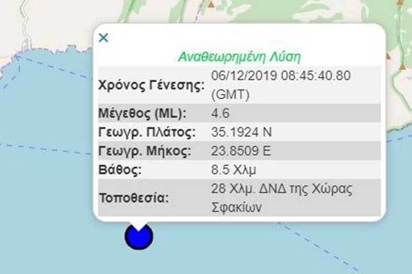 Σεισμική δόνηση μεγέθους 4,6 βαθμών της κλίμακας Ρίχτερ σημειώθηκε στις 10.45 το πρωί της Παρασκευής στην Κρήτη. Σύμφωνα με το Γεωδυναμικό Ινστιτούτο του Εθνικού Αστεροσκοπείου Αθηνών, το επίκεντρο του σεισμού εντοπίζεται 28 χιλιόμετρα δυτικά νοτιοδυτικά των Σφακίων, ενώ το εστιακό του βάθος υπολογίζεται στα 8,5 χλμ.