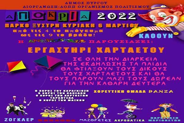 Δήμος Πύργου: «3η ΑΠΟΚΡΙΑ –ΠΥΡΓΟΣ 2022» -Γιορτή για τα παιδιά στο Θεματικό Πάρκο Ξυστρή την Κυριακή 6 Μαρτίου