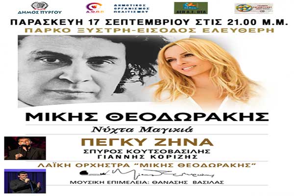Δήμος Πύργου: Συναυλία αφιέρωμα στη μνήμη και το έργο του Μίκη Θεοδωράκη στο Πάρκο Ξυστρή (17/9