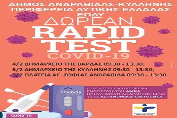 Δήμος Ανδραβίδας-Κυλλήνης: Rapid tests τη Πέμπτη στη Βάρδα και τη Παρασκευή σε Κυλλήνη και Ανδραβίδα