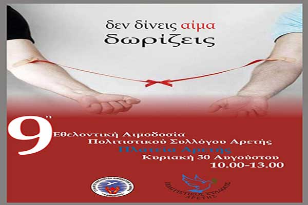Πολιτιστικός Σύλλογος Αρετής: Εθελοντική αιμοδοσία την Κυριακή 30/8