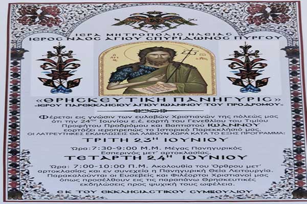 Ι.Ν. Αγ. Σπυρίδωνος Πύργου: Στις 24 Ιουνίου το Γενέθλιον του Αγίου ενδόξου Προφήτου Προδρόμου και Βαπτιστού Ιωάννου