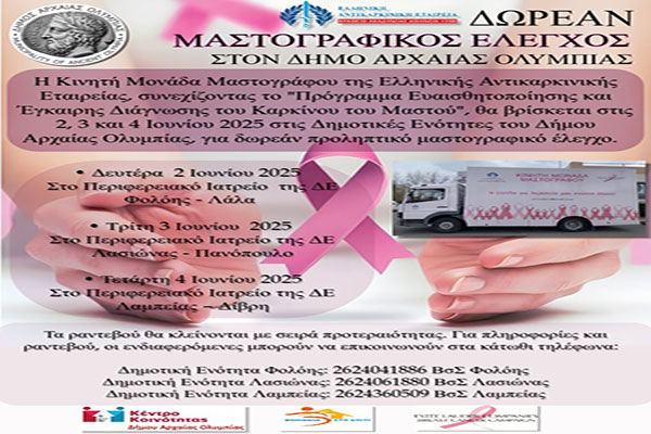 Δήμος Αρχαίας Ολυμπίας: Δωρεάν Μαστογραφικός Έλεγχος σε συνεργασία με την Ελληνική Αντικαρκινική Εταιρεία