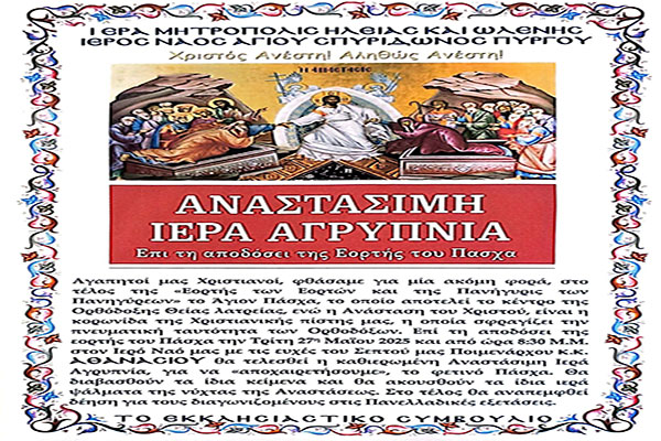 Ι.Ν. Αγ. Σπυρίδωνος Πύργου: Ιερά Αγρυπνία για την Απόδοση του Πάσχα σήμερα Τρίτη 27 Μαΐου