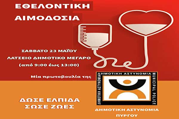 Δήμος Πύργου: Το Σάββατο 23 Μαΐου η Εθελοντική Αιμοδοσία από τη Δημοτική Αστυνομία