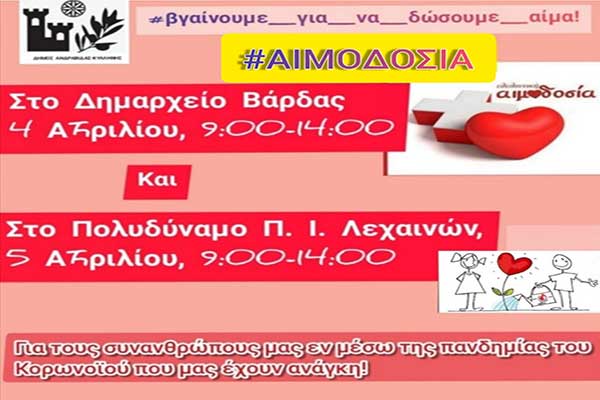Έκκληση για αίμα από τον Δήμο Ανδραβίδας-Κυλλήνης: «Μένουμε σπίτι - Βγαίνουμε για να δώσουμε αίμα, δίνουμε ζωή!»