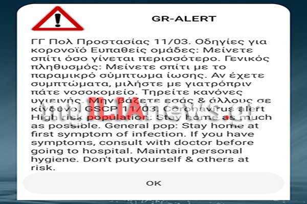 Ηλεία: Alert SMS από την Γενική Γραμματεία Πολιτικής Προστασίας για τον κορωνοϊό