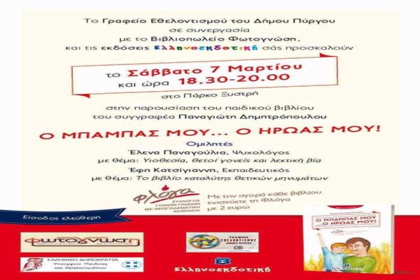 Γραφείο Εθελοντισμού Δήμου Πύργου: Αναβάλλεται η παρουσίαση του βιβλίου «Ο Μπαμπάς μου... ο ήρωας μου»