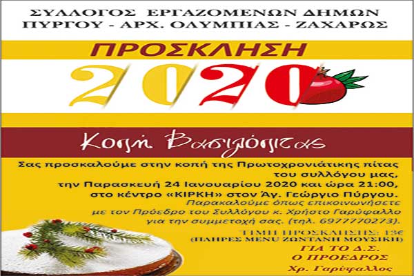 Ο Σύλλογος Εργαζομένων Δήμων Πύργου – Αρχ. Ολυμπίας – Ζαχάρως κόβει την Παρασκευή την πίτα του
