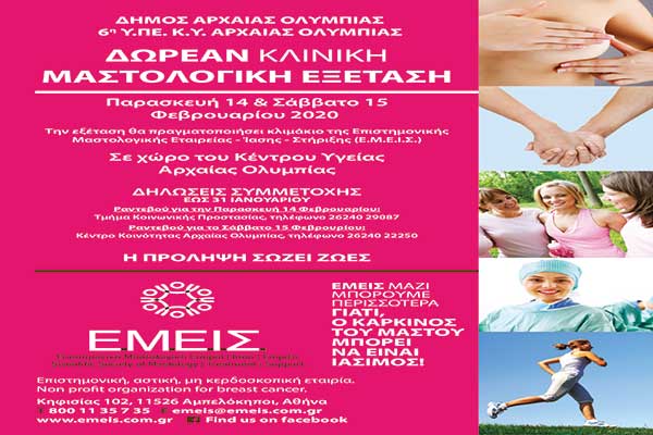 Δήμος Αρχαίας Ολυμπίας: Δωρεάν προληπτικός έλεγχος για τον καρκίνο του μαστού 14-15 Φεβρουαρίου