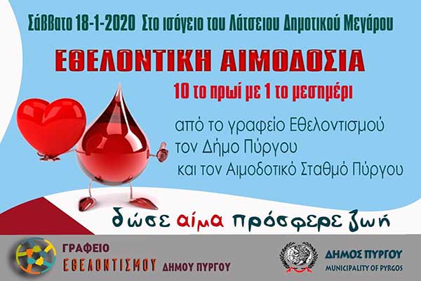 Δήμος Πύργου: Το Σάββατο 18 Ιανουαρίου η 1η Εθελοντική Αιμοδοσία από το Γραφείο Εθελοντισμού