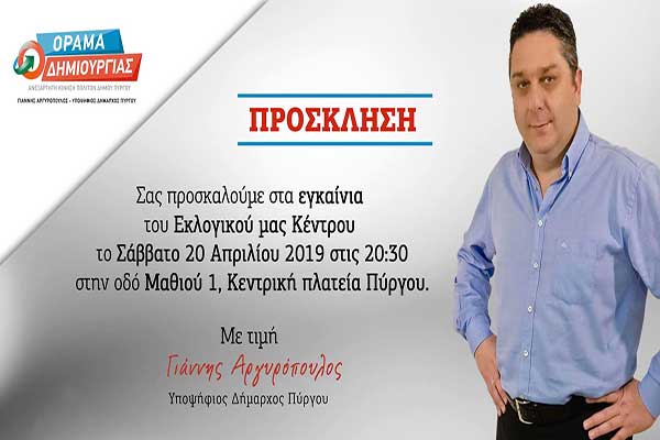Γιάννης Αργυρόπουλος-«Όραμα Δημιουργίας»: Το Σάββατο 20 Απριλίου τα εγκαίνια του εκλογικού κέντρου