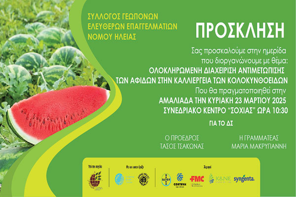 Σύλλογος Γεωπόνων Ελευθέρων Επαγγελματιών Ν.Ηλείας: Ημερίδα στις 23/3 για την "Ολοκληρωμένη διαχείριση αντιμετώπισης αφίδων στις καλλιέργειες των κολοκυνθοειδών"