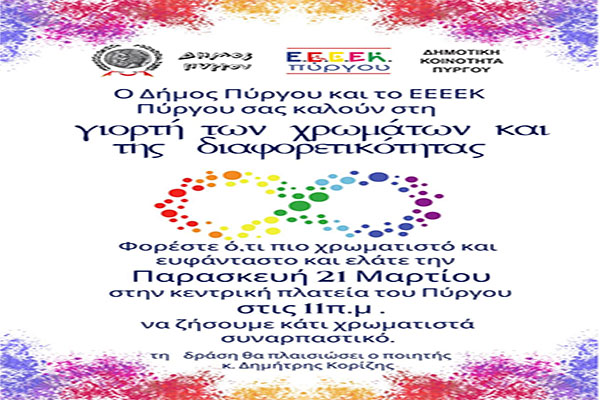 Δήμος Πύργου: Παγκόσμια Ημέρα Χρωμάτων, Συνδρόμου Down, Ποίησης, Δασοπονίας, Κουκλοθέατρου και Ρατσισμού