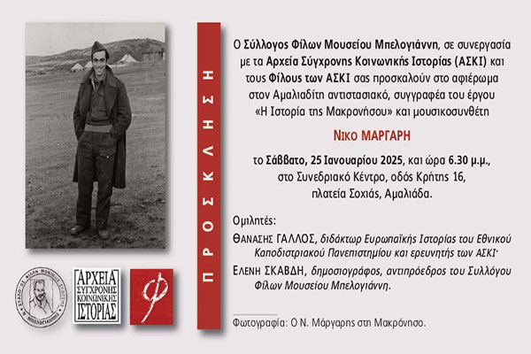 Σύλλογος Φίλων Μουσείου Μπελογιάννη: Εκδήλωση για το Νίκο Μάργαρη το Σάββατο 25 Ιανουαρίου
