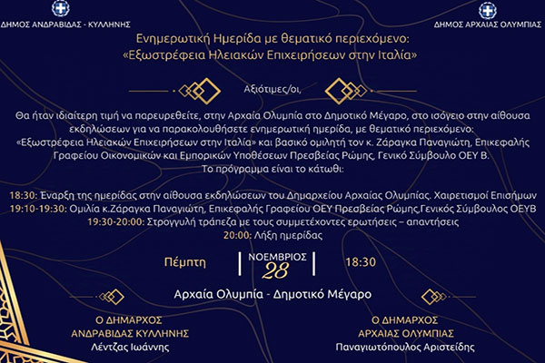 «Εξωστρέφεια Ηλειακών Επιχειρήσεων στην Ιταλία» - Ημερίδα στο Δημαρχείο Αρχαίας Ολυμπίας