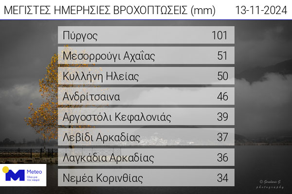Ξεπέρασε τα 100 mm το ύψος βροχής στον Πύργο μέχρι το πρωί της Τετάρτης 13/11