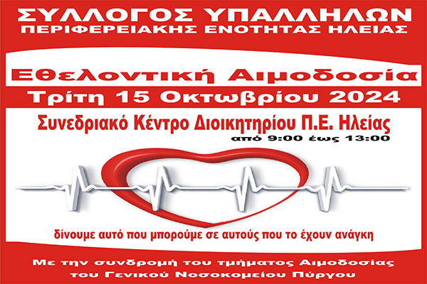 Σύλλογος Υπαλλήλων ΠΕ Ηλείας: Εθελοντική αιμοδοσία την Τρίτη 15 Οκτωβρίου