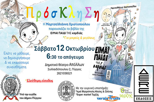 Η παρουσίαση του βιβλίου της Μαρτσελλιάνας Χριστοπούλου στο θέατρο «Απόλλων» τελεί υπό την αιγίδα του Δήμου Πύργου