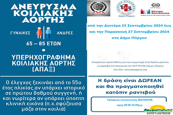 Δωρεάν Πρόγραμμα Ελέγχου για το Ανεύρυσμα Κοιλιακής Αορτής από το ΚΕΠ Υγείας του Δήμου Πύργου