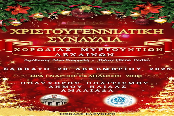 «Χριστουγεννιάτικη Συναυλία από τη Χορωδία Μυρτουντίων, υπό τη Λένα Σουρμελή, διοργανώνει ο Δήμος Ήλιδας στον Πολυχώρο Πολιτισμού το ερχόμενο Σάββατο»