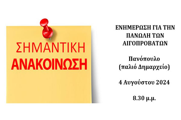 Δήμος Αρχαίας Ολυμπίας: Συνάντηση ενημέρωσης για την πανώλη των αιγοπροβάτων την Κυριακή 4 Αυγούστου στο Πανόπουλο