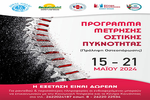 Δωρεάν πρόγραμμα μέτρησης οστικής πυκνότητας από το ΚΕΠ Υγείας Δήμου Ήλιδας, από Τετάρτη 15 Μαΐου έως Τρίτη 21 Μαΐου