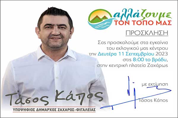 Τάσος Κάπος - Δήμος Ζαχάρως - Αλλάζουμε τον τόπο μας: Τη Δευτέρα τα εγκαίνια του εκλογικού κέντρου
