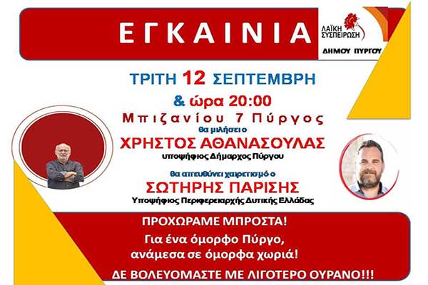Πύργος: Την Τρίτη 12/9 τα εγκαίνια του εκλογικού κέντρου της Λαϊκής Συσπείρωσης