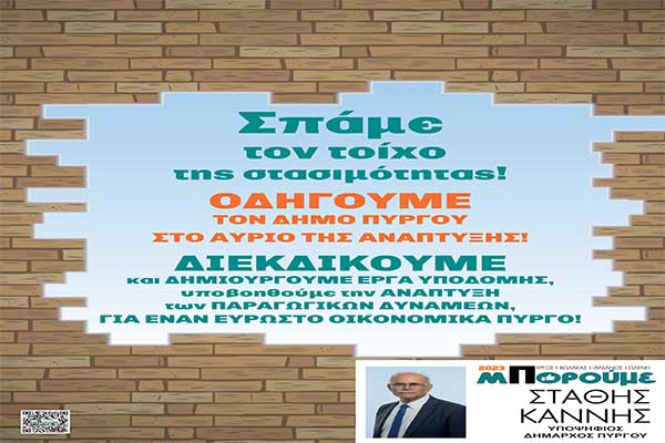 - Οι υποψήφιοι σύμβουλοι των Δημοτικών Ενοτήτων Βροχίτσας και Σκουροχωρίου που συστρατεύονται με το ψηφοδέλτιο νίκης της δημοτικής παράταξης Πύργου «ΜΠΟΡΟΥΜΕ – ΣΤΑΘΗΣ ΚΑΝΝΗΣ»