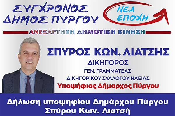 Δήλωση υποψηφίου Δημάρχου Πύργου Σπύρου Κων.Λιατσή: "Η αποκλειστική προσπάθεια της παράταξής μας επικεντρώνεται στην αυτόνομη κάθοδο"