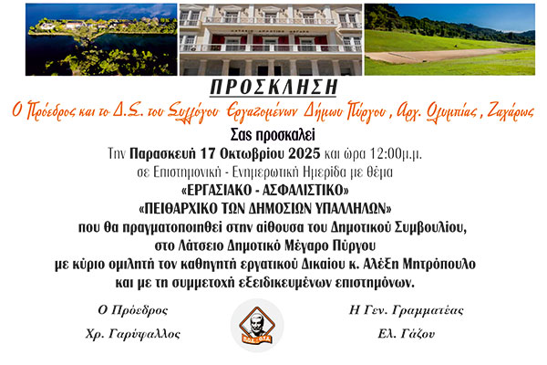 Σύλλογος Εργαζομένων Δήμων Πύργου-Αρχ.Ολυμπίας-Ζαχάρως: Επιστημονική – Ενημερωτική Ημερίδα την Παρασκευή 17/10