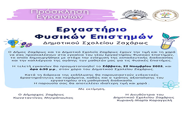 ο Δήμος Ζαχάρως και το Δημοτικό Σχολείο Ζαχάρως υποδέχονται την εκπαιδευτική κοινότητα, τους γονείς και τους φίλους του σχολείου στα εγκαίνια του νέου Εργαστηρίου Φυσικών Επιστημών.