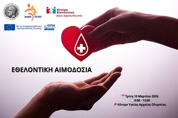 , μέσω του ΤμήματοςΚοινωνικήςΠροστασίας, του Κέντρου Κοινότητας και το «Βοήθεια στο Σπίτι» Αρχαίας Ολυμπίας, σε συνεργασία με το προσωπικό του Σταθμού Αιμοδοσίας και το Κέντρο Υγείας ΑρχαίαςΟλυμπίας, προκειμένου να ενισχύσει την Τράπεζα Αίματος που διατηρεί στο Γενικό Νοσοκομείο Πύργου διοργανώνει εθελοντική αιμοδοσία την Τρίτη 10 Μαρτίου 2026 και ώρες 9:00 έως 13:00, στο Κέντρο Υγείας Αρχαίας Ολυμπίας.