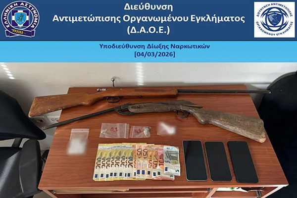 -4,7- γραμμάρια ακατέργαστης κάνναβης, -6- ναρκωτικά δισκία, -2- αεροβόλα τυφέκια και το χρηματικό ποσό των -1.865- ευρώ