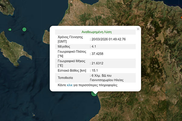 έγινε αισθητή στην Ηλεία σήμερα Παρασκευή 20 Μαρτίου στις 3:49 π.μ.