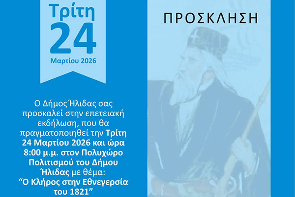 τιμώντας την εθνική επέτειο της παλιγγενεσίας του Έθνους, σας προσκαλεί στην επετειακή εκδήλωση, με τίτλο: «Ο ΚΛΗΡΟΣ ΣΤΗΝ ΕΘΝΕΓΕΡΣΙΑ ΤΟΥ 1821». Η εκδήλωση, που τελεί υπό τη σεπτή σκέπη της Ιεράς Μητροπόλεως Ηλείας και Ωλένης, θα πραγματοποιηθεί την Τρίτη 24 Μαρτίου 2026 και ώρα 20:00, στον Πολυχώρο Πολιτισμού Αμαλιάδας.