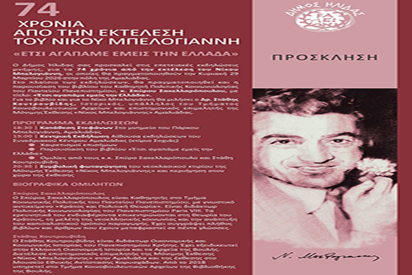 για την ιστορική διαδρομή του «ανθρώπου με το γαρύφαλλο», του Νίκου Μπελογιάννη, διοργανώνει την Κυριακή 29 Μαρτίου 2026 ο Δήμος Ήλιδας, με αφορμή τη συμπλήρωση 74 ετών από την εκτέλεση του. Η εκδήλωση, μεταξύ άλλων, αποτελεί έναν ζωντανό διάλογο ανάμεσα στο παρελθόν και το παρόν, αναδεικνύοντας τις αξίες που συμπυκνώνονται στη φράση: «Έτσι αγαπάμε εμείς την Ελλάδα».