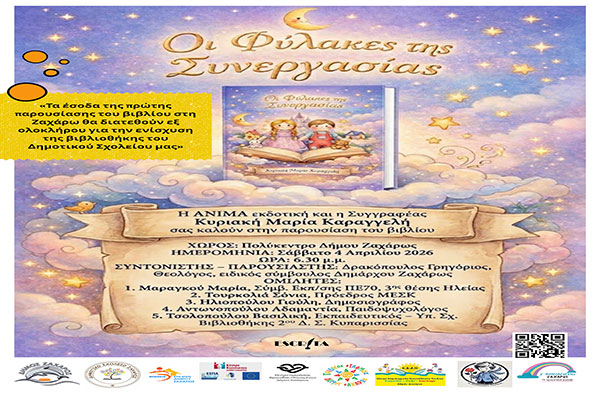 Πρόκειται για την παρουσίαση του παιδικού βιβλίου «Οι Φύλακες της Συνεργασίας» της συγγραφέα Κυριακή Μαρία Καραγγελή, η οποία θα πραγματοποιηθεί το Σάββατο 4 Απριλίου και ώρα 18:30, στο Πολύκεντρο Δήμου Ζαχάρως.