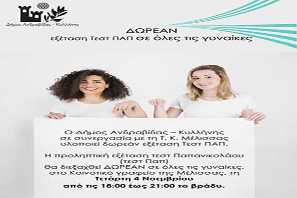 προαγωγή της υγείας των γυναικών, ο Δήμος Ανδραβίδας – Κυλλήνης σε συνεργασία με τη Τ. Κ. Μέλισσας υλοποιεί δωρεάν εξέταση Τεστ ΠΑΠ. Η προληπτική εξέταση τεστ Παπανικολάου (τεστ Παπ) θα διεξαχθεί ΔΩΡΕΑΝ σε όλες τις γυναίκες, στο Κοινοτικό γραφείο της Μέλισσας, τη Τετάρτη 4 Νοεμβρίου από τις 18:00 έως 21:00 το βράδυ.