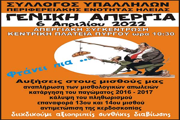 Ο Σύλλογος Υπαλλήλων ΠΕ Ηλείας συμμετέχει στην απεργία της 6ης Απριλίου