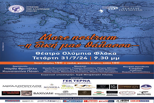 Λύκειο Ελληνίδων Πύργου: «Mare Nostrum - Η δική μας θάλασσα» την Τετάρτη 31/7 στο Θέατρο «ΟΛΥΜΠΙΑ», Φλόκα