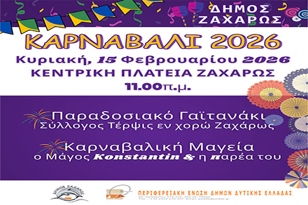 Ο Δήμος Ζαχάρως ανακοινώνει την αρχή των καρναβαλικών εκδηλώσεων για το Καρναβάλι Ζαχάρως 2026.