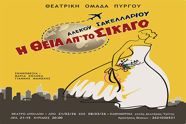 Την "Θεία απ'το Σικάγο" του Αλέκου Σακελλάριου παρουσιάζει η Θεατρική Ομάδα Πύργου στο Δημοτικό Θέατρο Απόλλων.